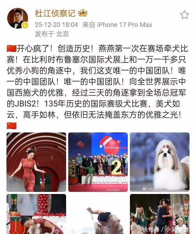 **开篇**12日,霍思燕和杜江夫妇因一场国际犬赛冠军刷屏热搜!霍思燕携爱犬“霍香香”出征比利时布鲁斯阿尔国际犬展,以唯一中国团队身份击败万余对手,创下历史性胜利。杜江连发三条动态狂喜:“我们做到了!”